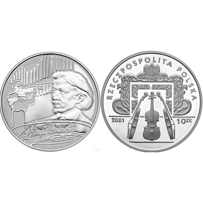 Awers: Powyżej stylizowanego pulpitu skrzypcowego i fortepianowego wizerunek orła ustalony dla godła Rzeczpospolitej Polskiej, poniżej troje skrzypiec. Z lewej strony oznaczenie roku emisji: 2001, z prawej strony napis: 10 ZŁ. U góry półkolem napis: RZECZPOSPOLITA POLSKA . Pod lewą łapą orła znak mennicy: MW.