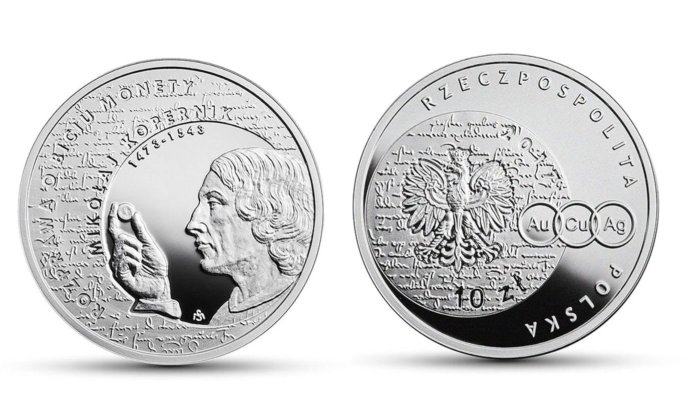 Awers: W centralnej części monety, wewnątrz medalionu – wizerunek orła ustalony dla godła Rzeczypospolitej Polskiej. Pod lewą łapą orła – znak menniczy: m/w. Pod wizerunkiem orła – nominał: 10 zł, rok emisji: 2017. W tle medalionu – stylizowana powierzchnia dekoracyjna: fragment „Traktatu o monecie”. Z prawej strony – trzy pierścienie z oznaczeniem pierwiastków chemicznych: Au (złota), Cu (miedzi), Ag (srebra). Wzdłuż otoku – kraj emitenta: RZECZPOSPOLITA POLSKA.
