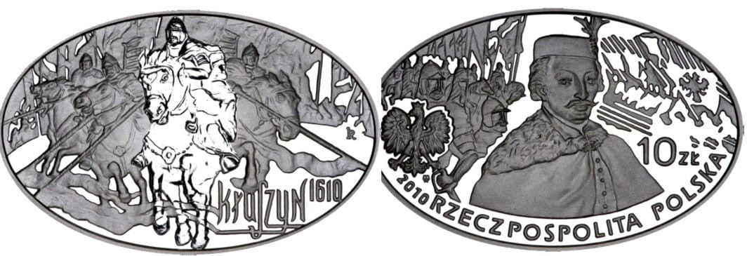 Awers: Centralnie stylizowany wizerunek hetmana Stanisława Żółkiewskiego na tle: z lewej strony - wojsk polskich, z prawej strony - wojsk moskiewskich. Z lewej strony, na tle wizerunku wojsk polskich, wizerunek orła ustalony dla godła Rzeczypospolitej Polskiej. Po prawej stronie u dołu napis: 10 ZŁ. Z lewej strony u dołu półkolem oznaczenie roku emisji oraz napis: RZECZPOSPOLITA POLSKA. Pod lewą łapą orła znak mennicy: M/W.