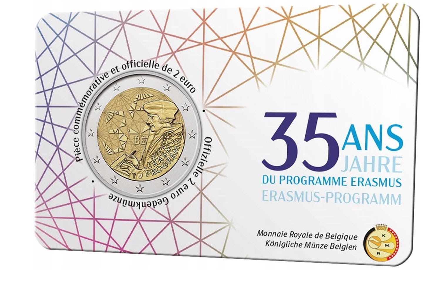 2 euro z 2022 r. poświęconą 35. rocznicy powstania programu Erasmus. Motyw monety przedstawia postać filozofa Erazma z Rotterdamu podczas pisania. W tle liczne linie łączą się w różnych punktach symbolizujący liczne wymiany intelektualne i ludzkie między studentami europejskimi. Wśród tych linii pojawia się również liczba 35, przedstawiona w nowoczesnym stylu graficznym, symbolizująca trzydziestą piątą rocznicę programu Erasmus.