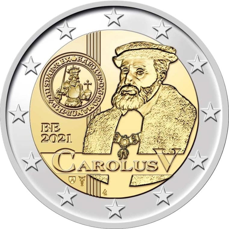 Opis: Na stronie narodowej monety, w części wewnętrznej, przedstawiono wizerunek Karola V wraz z napisem „Carolus V”. Na lewo odzwierciedlono 500-letniego złotego guldena, emitowanego po wydaniu zarządzenia w sprawie drugiego okresu emisji monet za panowania Karola V. Na dole umieszczono znak mennicy w Utrechcie, czyli laskę Merkurego (ponieważ monety będzie bić Holenderska Mennica Królewska), oraz znak mincmistrza Belgii – herb gminy Herzele. Widoczne są również inicjały projektanta monety Luca Luycxa „LL”. Po lewej stronie znajdują się kod kraju „BE” i oznaczenie roku „2021”. W otoku monety widnieje 12 gwiazd z flagi Unii Europejskiej.