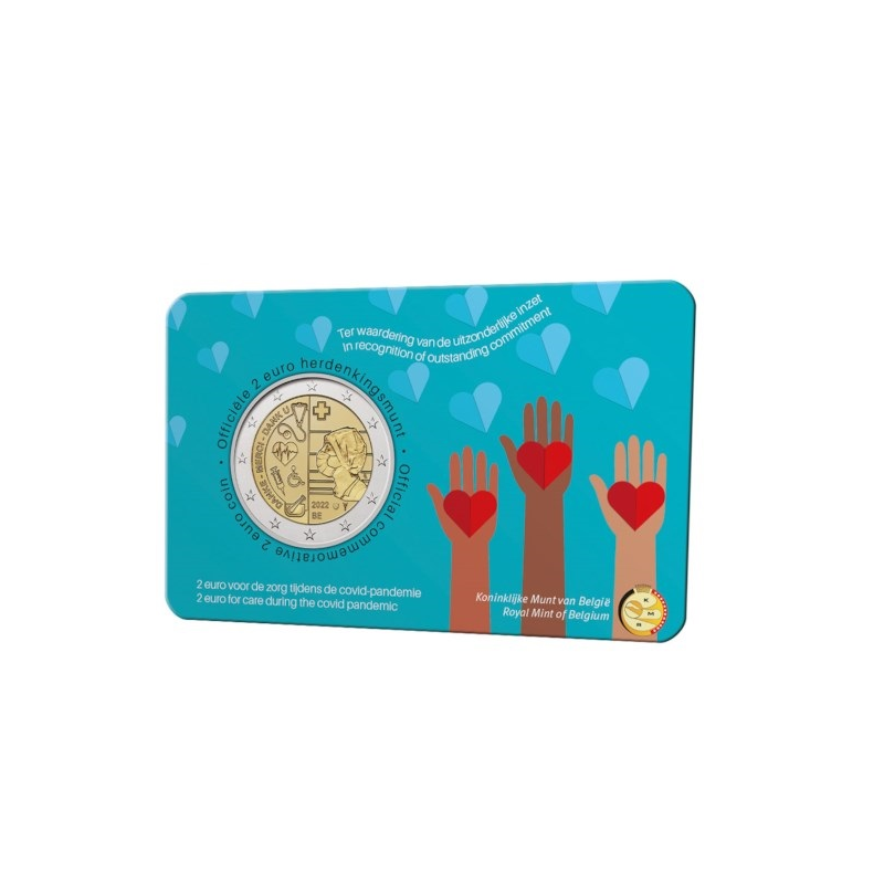 Opis: W wewnętrznej części monety przedstawiono pracownika medycznego. Po lewej stronie znajdują się słowa „DANKE – MERCI – DANK U” oraz piktogramy związane ze służbą zdrowia, od góry: krzyż, stetoskop, serce, strzykawka, wózek inwalidzki i roztwór chemiczny. Po prawej stronie znajdują się inicjały projektanta Luca Luycxa. U dołu umieszczono znak mennicy w Utrechcie – laskę Merkurego – ponieważ monety będzie bić Królewska Mennica Holenderska, znak mincmistrza Belgii – herb gminy Herzele – oraz kod kraju „BE” i rok emisji „2022”. W otoku monety widnieje 12 gwiazd z flagi Unii Europejskiej.