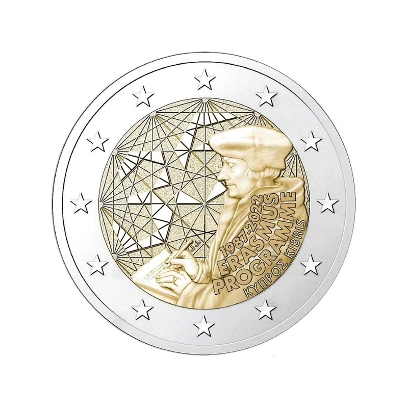 2 euro z 2022 r. poświęconą 35. rocznicy powstania programu Erasmus. Motyw monety przedstawia postać filozofa Erazma z Rotterdamu podczas pisania. W tle liczne linie łączą się w różnych punktach symbolizujący liczne wymiany intelektualne i ludzkie między studentami europejskimi. Wśród tych linii pojawia się również liczba 35, przedstawiona w nowoczesnym stylu graficznym, symbolizująca trzydziestą piątą rocznicę programu Erasmus.
