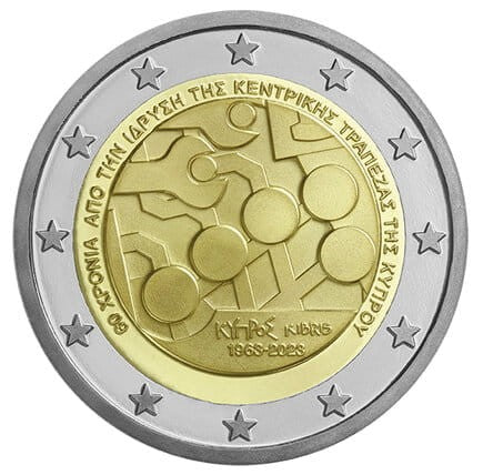 Opis: Na monecie przedstawiono narzędzia i mikrochip. Symbolizują one gospodarczą stabilność, którą we współczesnej erze przemysłowo‑cyfrowej zapewnia bank centralny Cypru, obchodzący 60‑lecie swojego istnienia. Na dole widać nazwę kraju emisji „ΚYΠΡΟΣ KIBRIS” i lata „1963-2023”. W wewnętrznej części narodowej strony monety znajduje się napis „60 ΧΡOΝΙΑ ΑΠO ΤΗΝ IΔΡΥΣΗ ΤΗΣ ΚΕΝΤΡΙKHΣ ΤΡAΠΕΖΑΣ ΤΗΣ ΚYΠΡΟΥ” (60 LAT OD POWSTANIA CENTRAL BANK OF CYPRUS). W otoku monety widnieje 12 gwiazd z flagi Unii Europejskiej.