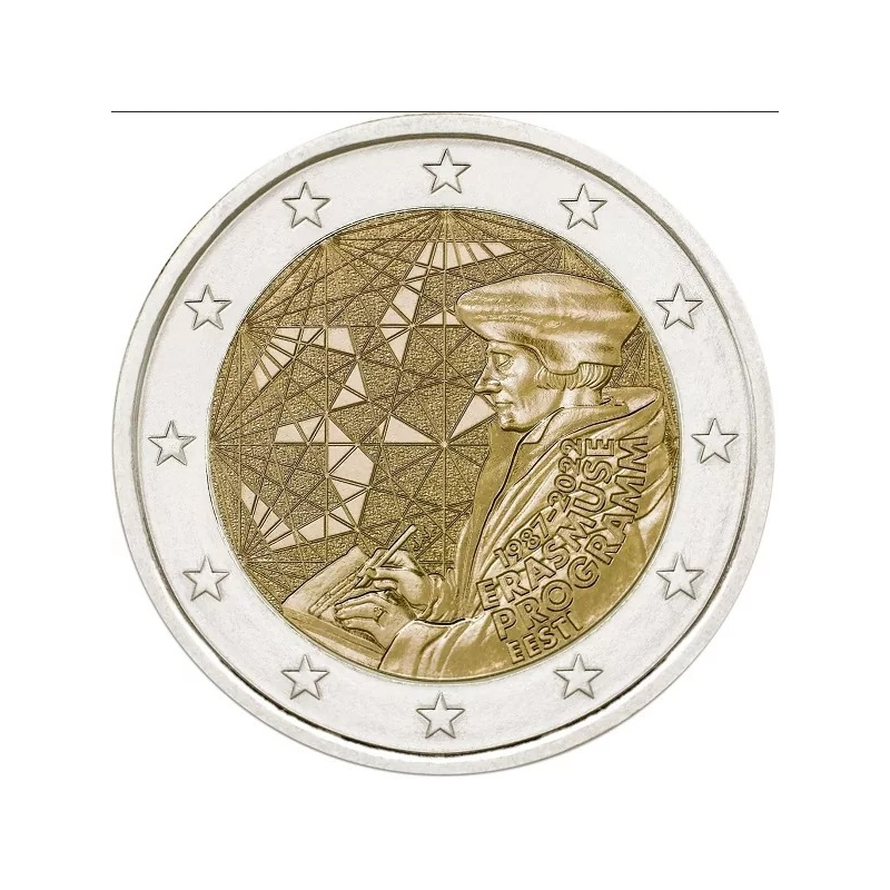 2 euro z 2022 r. poświęconą 35. rocznicy powstania programu Erasmus. Motyw monety przedstawia postać filozofa Erazma z Rotterdamu podczas pisania. W tle liczne linie łączą się w różnych punktach symbolizujący liczne wymiany intelektualne i ludzkie między studentami europejskimi. Wśród tych linii pojawia się również liczba 35, przedstawiona w nowoczesnym stylu graficznym, symbolizująca trzydziestą piątą rocznicę programu Erasmus.