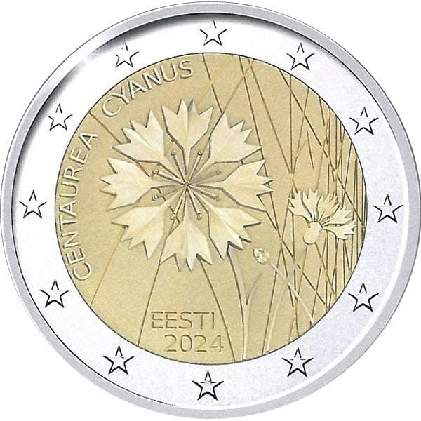 Opis: Moneta przedstawia kształt chabra bławatka, nad którym po lewej stronie biegnie półkoliście jego łacińska nazwa „CENTAUREA CYANUS”. Na dole znajduje się nazwa kraju emisji „EESTI”, a poniżej – rok emisji „2024”. W otoku monety widnieje 12 gwiazd z flagi Unii Europejskiej.