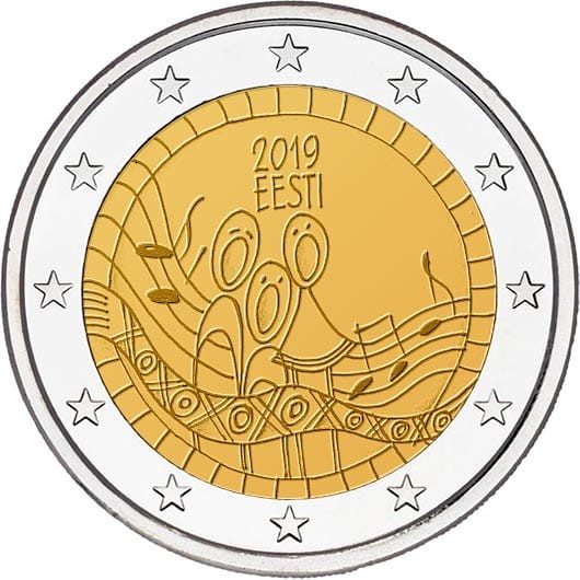 Opis: Motywem monety jest falujący pochód dumnych i radosnych śpiewaków w strojach ludowych. Ten wzór łączy w sobie muzykę, folklor i miejsca związane ze wspaniałym świętem piosenki w tym nadbałtyckim kraju. Umieszczono na nim także początkowe nuty hymnu Estonii. Pod głównym motywem znajduje się napis „Laulupidu 150” (Festiwal pieśni 150), a na górze w dwóch rzędach – rok emisji „2019” i nazwa kraju „EESTI” (Estonia). W otoku monety widnieje 12 gwiazd Unii Europejskiej.
