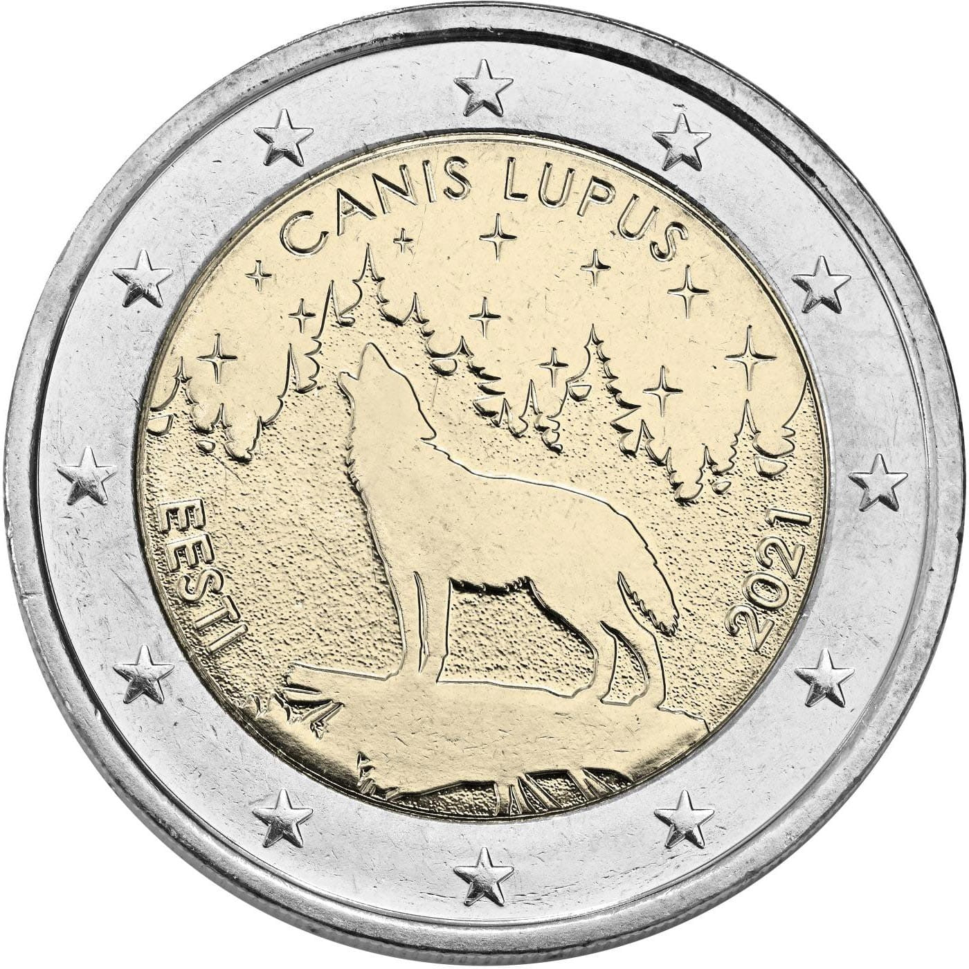 Opis: Wzór przedstawia sylwetkę wilka na tle lasu. Przy krawędzi wewnętrznej części monety po lewej stronie widnieje nazwa państwa „EESTI”, po prawej stronie – rok emisji „2021”, a na górze – napis „CANIS LUPUS” („wilk” po łacinie).