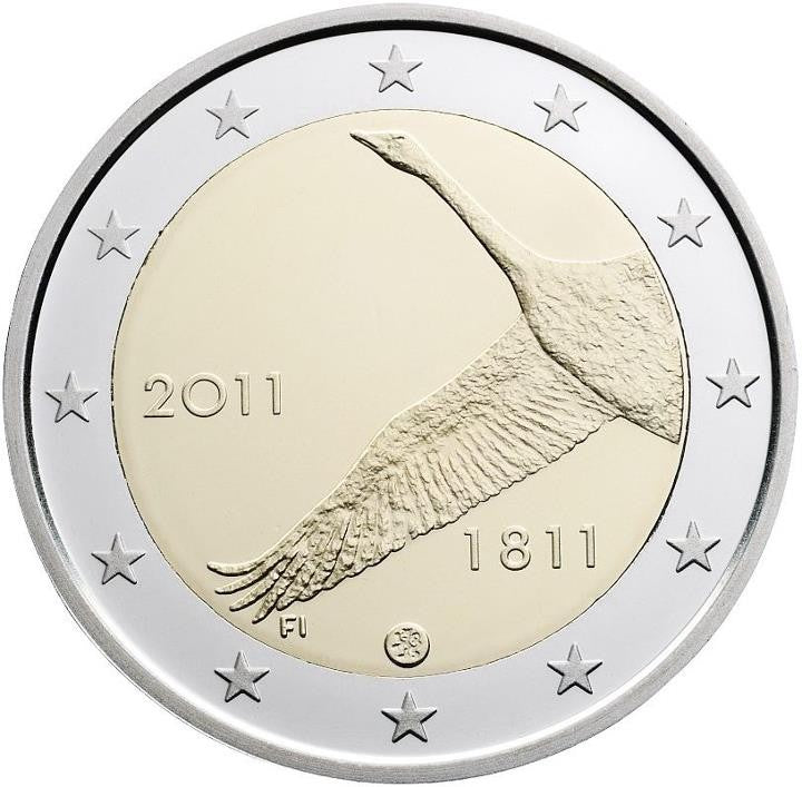 Opis: Moneta okolicznościowa upamiętniająca 200-lecie Suomen Pankki, zaprojektowana przez Hannu Veijalainena, przedstawia łabędzia – narodowego ptaka Finlandii. W wewnętrznej części monety widnieją też oznaczenia lat: „2011” – rok emisji, oraz „1811” – rok, w którym car Rosji Aleksander I wydał dekret o ustanowieniu w fińskim mieście Turku „Kantoru Walutowego, Kredytowego i Depozytowego”. Ten pierwszy bank w Finlandii, przemianowany później na Suomen Pankki, od 1819 roku ma siedzibę w Helsinkach. Funkcje banku centralnego zaczął pełnić w drugiej połowie XIX wieku, kiedy Finlandia uzyskała własną walutę i zaczęły powstawać banki komercyjne. W otoku monety widnieje 12 gwiazd Unii Europejskiej.
