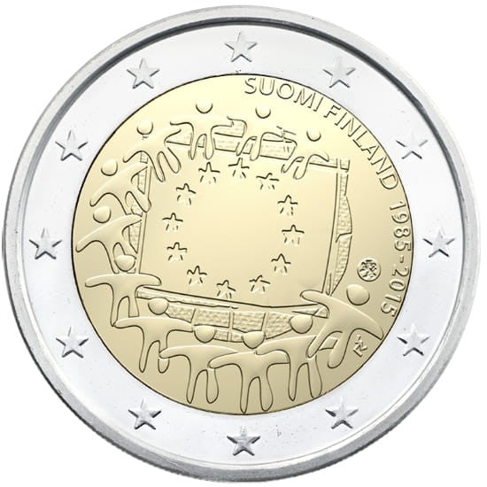 Opis: Moneta przedstawia unijną flagę jako symbol, który jednoczy ludzi i kultury wokół wizji i ideałów lepszej wspólnej przyszłości. Dwanaście gwiazd przechodzących w postaci ludzi okala narodziny nowej Europy. Górą po prawej stronie biegną po półokręgu nazwa kraju emisji i daty „1985–2015”, a niżej znajduje się monogram projektanta Georgiosa Stamatopoulosa. W otoku monety widnieje 12 gwiazd Unii Europejskiej.