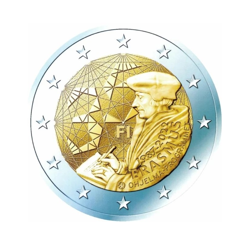 2 euro z 2022 r. poświęconą 35. rocznicy powstania programu Erasmus. Motyw monety przedstawia postać filozofa Erazma z Rotterdamu podczas pisania. W tle liczne linie łączą się w różnych punktach symbolizujący liczne wymiany intelektualne i ludzkie między studentami europejskimi. Wśród tych linii pojawia się również liczba 35, przedstawiona w nowoczesnym stylu graficznym, symbolizująca trzydziestą piątą rocznicę programu Erasmus.