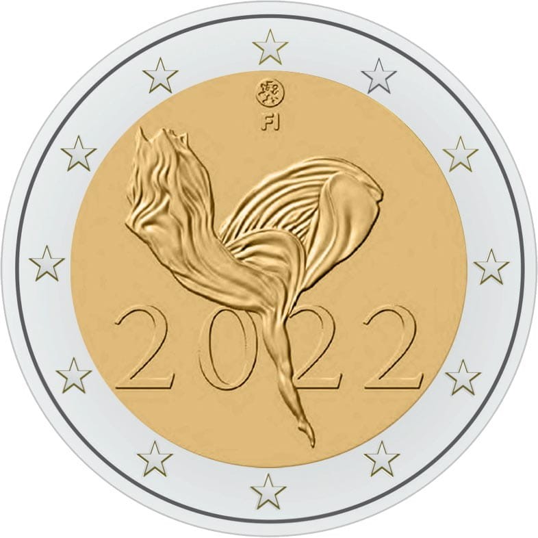 Opis: Wzór przedstawia energiczne i płynne ruchy tańczącej osoby ubranej w lekką, powiewną tkaninę, która podkreśla piękno i swobodę figury tanecznej. Na monecie umieszczono także rok emisji „2022” oraz, na górze, symbol kraju emisji „FI” i znak mennicy. W otoku monety widnieje 12 gwiazd z flagi Unii Europejskiej.