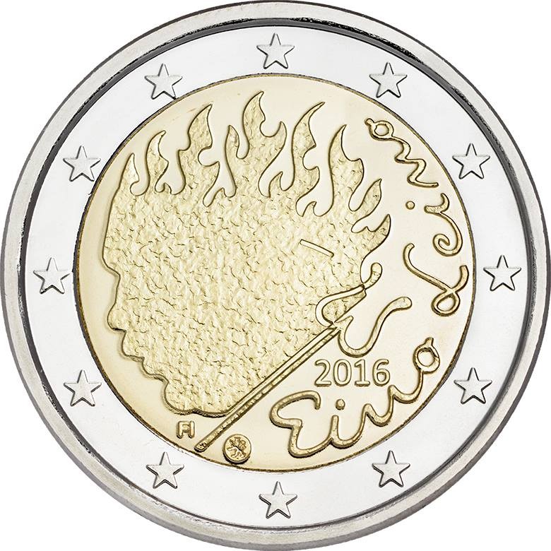 Opis: Wewnętrzna część monety przedstawia płomień oraz pogrzebacz skierowany w prawo do góry. Po prawej stronie biegnie półkoliście napis „EINO LEINO”, obok którego umieszczono rok emisji „2016”. U dołu z lewej strony znajdują się oznaczenie kraju emisji „FI” i znak mennicy. W otoku monety widnieje 12 gwiazd Unii Europejskiej.