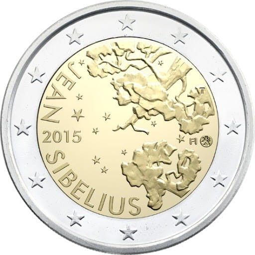 Opis: Tłem wzoru jest gwiaździste niebo; na pierwszym planie po prawej stronie widać korony drzew. Z lewej strony przy otoku znajdują się imię i nazwisko „JEAN SIBELIUS” rozdzielone rokiem emisji „2015”. Z prawej strony umieszczono oznaczenie kraju emisji „FI” oraz znak mennicy. W otoku monety widnieje 12 gwiazd Unii Europejskiej.