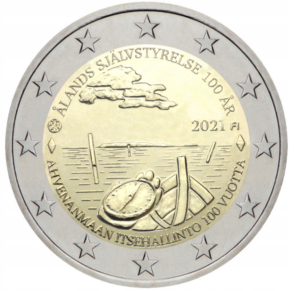 Opis: Motywem monety jest krajobraz archipelagu złożony z tłoczonych elementów. W dolnej połowie znajduje się droga morska ze znakami żeglugowymi, dziób łodzi i dłoń trzymająca kompas. W poprzek środkowej części przebiega morski horyzont. W górnej połowie umieszczono niebo i chmury. Na dole biegnie półkoliście napis „STO LAT AUTONOMII WYSP ALANDZKICH” w języku fińskim, a u góry – ten sam napis w języku szwedzkim. W środku między napisami widać dwa punkty w kształcie diamentów: jeden po lewej, a drugi po prawej stronie. Powyżej diamentów z prawej strony widoczny jest napis „2021 FI”, zaś z lewej – znak mennicy fińskiej. W otoku monety widnieje 12 gwiazd z flagi Unii Europejskiej.