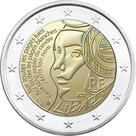 Opis: Obchody powstania Republiki Francuskiej to wydarzenie jednoczące wszystkich Francuzów. Moneta przedstawia profil Marianny, uosabiającej Republikę, narysowany nowoczesną, graficzną kreską. Marianna ma na głowie czapkę frygijską. Po prawej stronie widnieje schematycznie naszkicowana rewolucyjna kokarda w kształcie rozety, a pod nią monogram Republiki Francuskiej „RF”. Pośrodku wzoru znajduje się oznaczenie roku „2015”. Po lewej stronie umieszczono strofę z wiersza francuskiego poety Paula Eluarda pod tytułem „Wolność” (nawiązanie do dewizy Republiki). Pod tekstem znajdują się znaki mennicze. W otoku monety widnieje 12 gwiazd Unii Europejskiej.