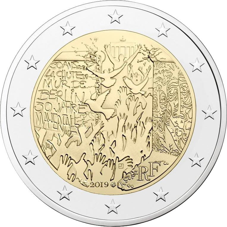 Motywem monety jest mur berliński; przez wyrwę pośrodku przelatują gołębie (alegoria międzynarodowego procesu pokojowego) i idzie świętujący tłum. W tle widać Bramę Brandenburską, najbardziej rozpoznawalną budowlę Berlina. Z boku na murze widnieje napis po francusku i niemiecku „30 ans de la chute du Mur de Berlin/30 Jahre Mauerfall” (30. rocznica upadku muru berlińskiego). Na dole przy otoku znajdują się oznaczenia roku i kraju emisji – „2019” i „RF” (Republika Francuska). W otoku monety widnieje 12 gwiazd Unii Europejskiej.