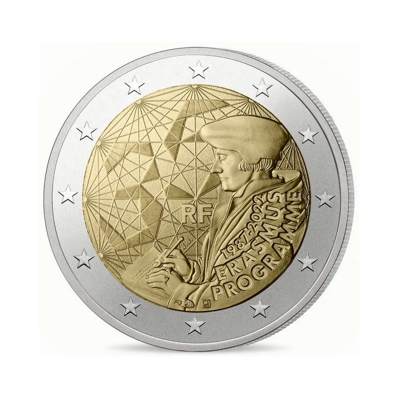 2 euro z 2022 r. poświęconą 35. rocznicy powstania programu Erasmus. Motyw monety przedstawia postać filozofa Erazma z Rotterdamu podczas pisania. W tle liczne linie łączą się w różnych punktach symbolizujący liczne wymiany intelektualne i ludzkie między studentami europejskimi. Wśród tych linii pojawia się również liczba 35, przedstawiona w nowoczesnym stylu graficznym, symbolizująca trzydziestą piątą rocznicę programu Erasmus.