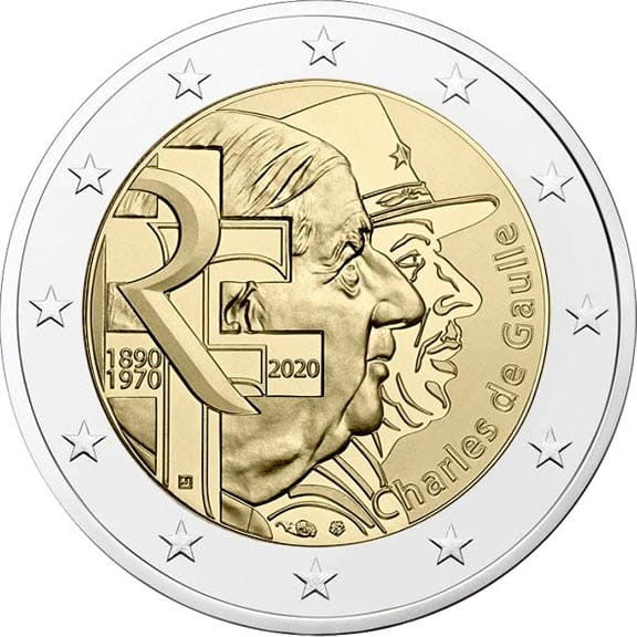 Opis: Na monecie przedstawiono dwa profile Charles’a de Gaulle’a z dwóch różnych okresów. W tle widać de Gaulle’a w mundurze generała armii, jaki nosił 18 czerwca 1940, kiedy wygłosił apel wzywający lud francuski do walki z okupantem, lub podczas wyzwolenia Paryża. Na pierwszym planie znajduje się profil de Gaulle’a z okresu jego drugiej kadencji prezydenckiej. Elementem wzoru jest także monogram Republiki Francuskiej „RF” nałożony na krzyż lotaryński, który generał de Gaulle wybrał w 1940 na godło Wolnej Francji. Na krzyżu ukazano również daty urodzenia i śmierci generała oraz rok emisji monety. W otoku monety widnieje 12 gwiazd z flagi Unii Europejskiej.