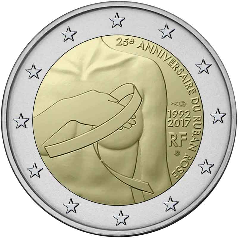 Motywem monety jest pierś kobieca, którą symbolicznie chronią dłoń i wstążka. Po prawej stronie biegnie półkoliście napis „25e ANNIVERSAIRE DU RUBAN ROSE” (25. rocznica różowej wstążki). Z prawej strony znajdują się także daty „1992” i „2017”, oznaczenie kraju emisji „RF” i znaki mennicze. W otoku monety widnieje 12 gwiazd Unii Europejskiej.