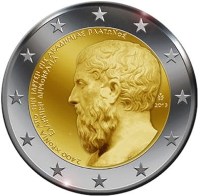 Opis: Moneta przedstawia profil Platona. Po lewej stronie widać napisy „2400 lat od założenia Akademii Platońskiej” oraz „Republika Grecka”, zapisane starożytnym pismem greckim. Po prawej stronie umieszczono oznaczenie roku „2013” oraz monogram mennicy greckiej. W otoku monety widnieje 12 gwiazd Unii Europejskiej.