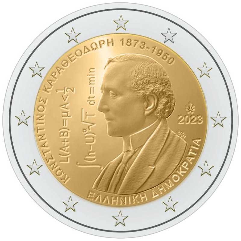 Opis: Moneta przedstawia portret greckiego matematyka Constantina Carathéodory’ego. Po lewej stronie wzdłuż wewnętrznej krawędzi otoku umieszczono napis „ΚΩΝΣΤΑΝΤΙΝΟΣ ΚΑΡΑΘΕΟΔΩΡΗ 1873−1950” (CONSTATIN CARATHÉODORY 1873−1950). Po prawej stronie znajdują się rok emisji „2023” i palmeta (znak mennicy greckiej). Pod portretem biegnie napis „ΕΛΛΗΝΙΚΗ ΔΗΜΟΚΡΑΤΙΑ” (REPUBLIKA GRECKA). W otoku monety widnieje 12 gwiazd z flagi Unii Europejskiej.
