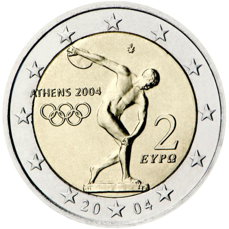 Opis: Antyczny posąg przedstawiający dyskobola w momencie rzutu dyskiem, otoczony 12 gwiazdami Unii Europejskiej umieszczonymi na zewnętrznym pierścieniu. Podstawa posągu zakrywa niewielką część zewnętrznego pierścienia monety. Po lewej stronie znajduje się logo Igrzysk Olimpijskich „ATHENS 2004” i pięć kół olimpijskich. Po prawej – cyfra „2” i słowo „ ΕΥΡΩ ”. Oznaczenie roku umieszczono wokół gwiazdy położonej pośrodku, u podstawy posągu, przy czym dzieli ona cyfry w następujący sposób: 20*04. Powyżej głowy sportowca, po lewej stronie, widnieje znak mennicy.