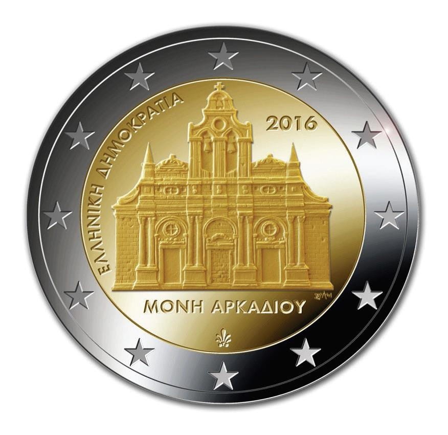 Opis: Moneta przedstawia klasztor Arkadi. Poniżej głównego motywu umieszczono centralnie nazwę klasztoru w języku greckim „ΜΟΝΗ ΑΡΚΑΔΙΟΥ”, a po lewej stronie wzdłuż otoku – napis „ΕΛΛΗΝΙΚΗ ΔΗΜΟΚΡΑΤΙΑ” (Republika Grecka). Po prawej stronie u góry wybito rok emisji „2016”. Pod dolnym napisem znajduje się palmeta będąca znakiem Mennicy Greckiej, a z prawej strony – monogram grawera Georgiosa Stamatopoulosa. W otoku monety widnieje 12 gwiazd Unii Europejskiej.