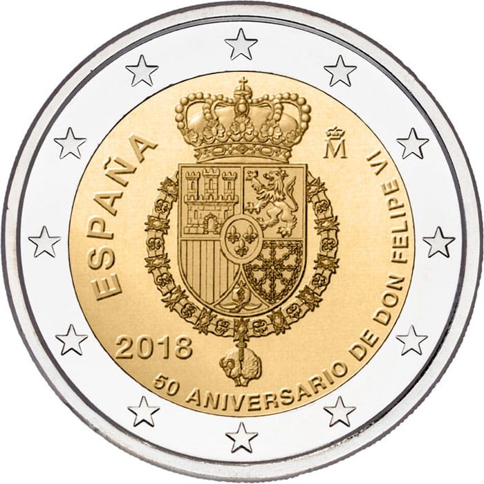 Opis: Centralnym motywem monety jest herb króla Filipa VI. Z lewej strony umieszczono półkoliście nazwę kraju „ESPAÑA” (Hiszpania), a pod nią poziomo rok emisji „2018”. W prawej dolnej części biegnie półkoliście napis „50 ANIVERSARIO DE S.M. FELIPE VI” (50. urodziny Jego Wysokości Filipa VI). Z prawej strony na górze znajduje się znak mennicy. W otoku monety widnieje 12 gwiazd Unii Europejskiej.