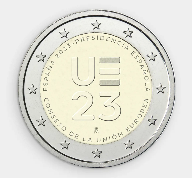 Opis: Motyw przedstawia dwa obrazy. Pierwszym z nich jest logo hiszpańskiej prezydencji w Radzie UE. Logo otaczają napisy: „ESPAÑA 2023 – PRESIDENCIA ESPAÑOLA” (HISZPANIA 2023 – PREZYDENCJA HISZPAŃSKA) i „CONSEJO DE LA UNIÓN EUROPEA” (RADA UNII EUROPEJSKIEJ). Drugi obraz, w egzerdze, przedstawia znak mennicy Fábrica Nacional de Moneda y Timbre Real Casa de la Moneda, czyli literę „M” w koronie. W otoku monety widnieje 12 gwiazd z flagi Unii Europejskiej.