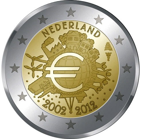 W styczniu 2012 roku dla upamiętnienia dziesiątej rocznicy banknotów i monet euro wszystkie państwa strefy euro wyemitują nową monetę okolicznościową. Jej projekt został wybrany w głosowaniu internetowym przez obywateli i mieszkańców strefy euro. Zwycięski projekt uznano za najlepszy z pięciu wzorów, które zostały wyłonione wcześniej przez profesjonalne jury w konkursie otwartym dla obywateli wszystkich państw strefy euro.