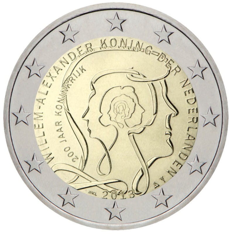 Opis: W wewnętrznej części monety widnieje wstążka, która układa się w profil króla Wilhelma Aleksandra i dalej przechodzi w coraz mniejsze profile jego sześciu poprzedników: królowej Beatrycze, królowej Juliany, królowej Wilhelminy, króla Wilhelma III, króla Wilhelma II i króla Wilhelma I. Początek wstążki zachodzi na otok. Wokół portretów biegnie napis „WILLEM-ALEXANDER KONING DER NEDERLANDEN” (Wilhelm Aleksander król Niderlandów), a za nim – znak holenderskiej mennicy królewskiej, znak mincmistrza, oznaczenie roku „2013” i inicjały projektanta. Po lewej stronie widać napis „200 JAAR KONINKRIJK” (200 lat królestwa). W otoku monety widnieje 12 gwiazd Unii Europejskiej.