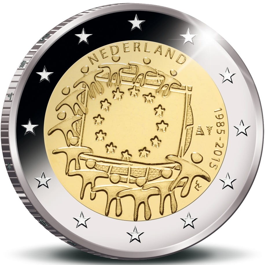 Opis: Moneta przedstawia unijną flagę jako symbol, który jednoczy ludzi i kultury wokół wizji i ideałów lepszej wspólnej przyszłości. Dwanaście gwiazd przechodzących w postaci ludzi okala narodziny nowej Europy. Górą po prawej stronie biegną po półokręgu nazwa kraju emisji i daty „1985–2015”, a niżej znajduje się monogram projektanta Georgiosa Stamatopoulosa. W otoku monety widnieje 12 gwiazd Unii Europejskiej.