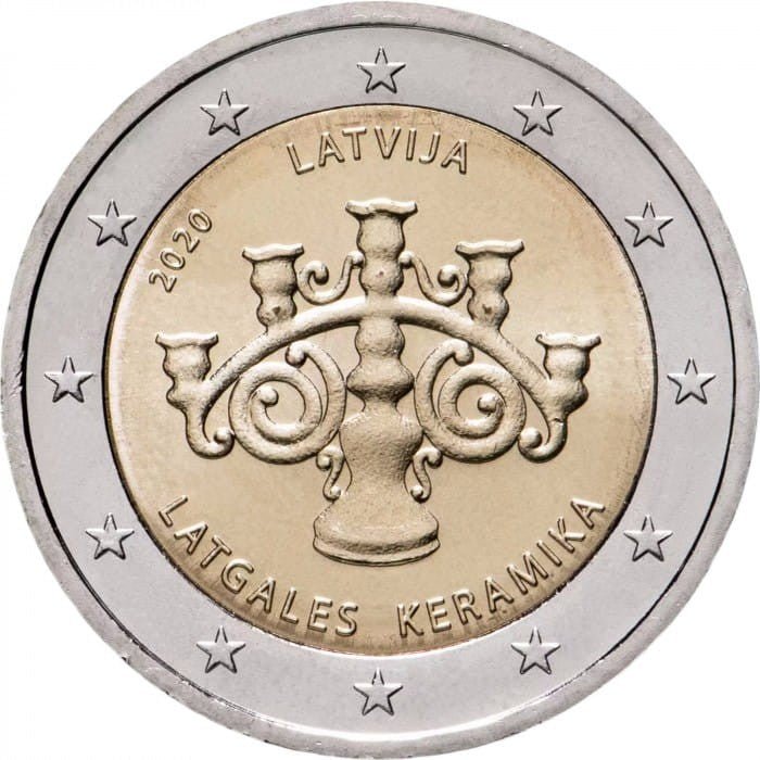 Opis: Moneta jest poświęcona garncarstwu łatgalskiemu. Tradycyjne garncarstwo przez długi czas było obecne w dwóch krainach – Łatgalii i Kurlandii, ale tylko w tej pierwszej przetrwało upływ czasu jako rzemiosło przekazywane z pokolenia na pokolenie. Garncarstwo łatgalskie należy również do kanonu kultury łotewskiej. Głównym motywem monety jest gliniany kandelabr, jako typowy przykład ceramiki łatgalskiej. Na dole widnieje napis „LATGALES KERAMIKA” (ceramika łatgalska), a na górze – nazwa kraju „LATVIJA” i rok emisji „2020”. W otoku monety widnieje 12 gwiazd z flagi Unii Europejskiej.