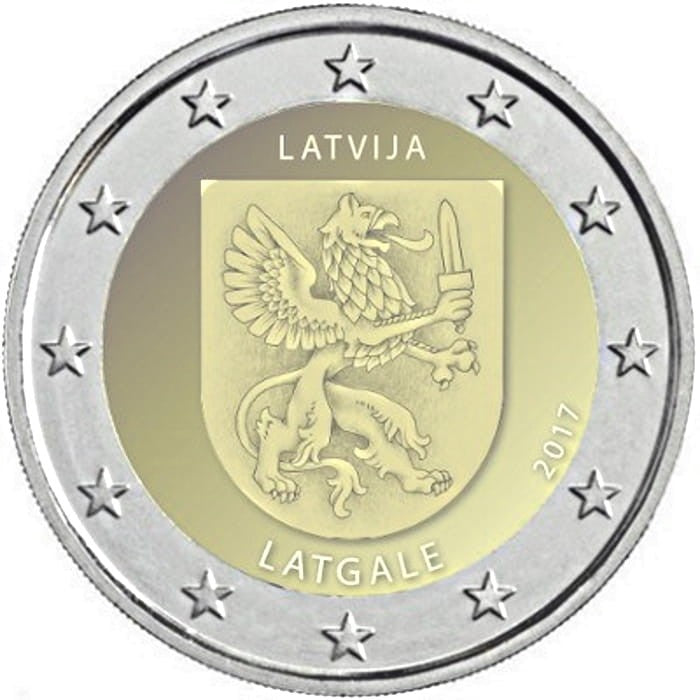 Opis: Motywem monety jest herb jednego z regionów Łotwy – Łatgalii (łot. Latgale). Nad herbem znajduje się nazwa kraju emisji „LATVIJA” (Łotwa), a pod nim – nazwa regionu „LATGALE”. Po prawej stronie umieszczono rok emisji „2017”. W otoku monety widnieje 12 gwiazd Unii Europejskiej.
