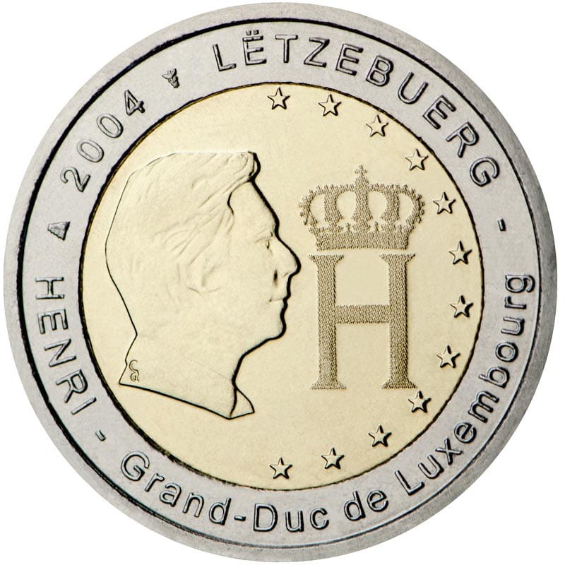 Opis: Po lewej stronie w części wewnętrznej monety znajduje się wizerunek Jego Królewskiej Wysokości Wielkiego Księcia Henryka zwróconego w prawo, a po prawej stronie – monogram Wielkiego Księcia Henryka (specjalna litera „H” zwieńczona koroną). Po prawej stronie monogramu znajduje się 12 gwiazd tworzących półkole. Rok 2004 otoczony znakiem mennicy i inicjałami grawera oraz słowo LËTZEBUERG wpisane są koliście u góry pierścienia. U dołu pierścienia znajdują się słowa „- HENRI - Grand-Duc de Luxembourg”.
