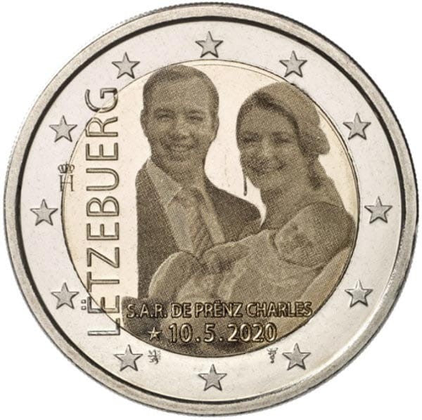Opis: Motyw przedstawia w centrum wizerunki księcia Karola i jego rodziców, Ich Królewskich Wysokości dziedzicznego wielkiego księcia Wilhelma i dziedzicznej wielkiej księżnej Stefanii. Pod ich podobiznami znajduje się napis „S.A.R. de Prënz Charles” (Jego Królewska Wysokość książę Karol) oraz data urodzenia księcia „10 maja 2020”. Po lewej stronie widnieje zapisana pionowo nazwa państwa emitującego „LËTZEBUERG” oraz monogram (litera „H” w koronie), będący znakiem wielkiego księcia Henryka. Na zewnętrznym otoku monety umieszczonych jest dwanaście gwiazd flagi europejskiej.