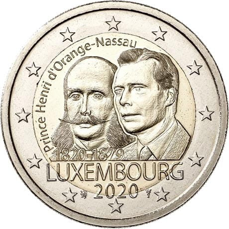 Opis: Po prawej stronie przedstawiono wizerunek obecnie panującego wielkiego księcia Henryka, a po lewej – księcia Henryka. Na dole znajdują się nazwa państwa emitującego „LUXEMBOURG” i oznaczenie roku „2020”. Po lewej stronie biegnie półkoliście napis „Prince Henri d’Orange-Nassau” (książę Henryk Orański-Nassau). Pod wizerunkiem księcia umieszczono daty „1820–1879”. W otoku monety widnieje 12 gwiazd z flagi Unii Europejskiej.