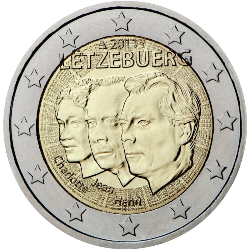 Opis: W środkowej części monety po prawej stronie widnieje podobizna wielkiego księcia Henryka, zwrócona w lewo, na tle wizerunków wielkiego księcia Jana i wielkiej księżnej Charlotty. Nad nimi znajduje się napis „LËTZEBUERG”, a powyżej rok „2011” między znakami mennicy i mincmistrza. Pod wizerunkami władców widnieją ich imiona.