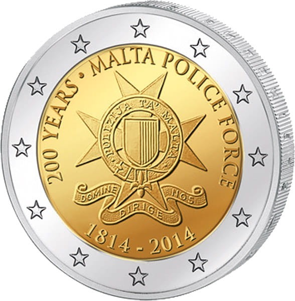 Opis: Moneta upamiętnia dwusetlecie policji maltańskiej, utworzonej na mocy proklamacji XXII z roku 1814. Jest to jedna z najstarszych policji w Europie. Narodowa strona monety przedstawia odznakę policji maltańskiej otoczoną napisem „200 YEARS MALTA POLICE FORCE” (200 lat policji maltańskiej) oraz oznaczeniem lat „1814–2014”. W otoku monety widnieje 12 gwiazd Unii Europejskiej.