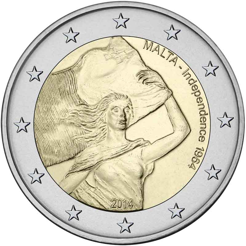 Opis: Moneta upamiętniająca konstytucję z 1964 roku – Akt niepodległości Malty – jest czwartą z serii pięciu monet przedstawiających najważniejsze wydarzenia konstytucyjne w historii tego kraju. Na mocy konstytucji z 1964 roku Malta po wiekach obcej dominacji stała się niepodległa. Narodowa strona monety ukazuje fragment odlanego z brązu pomnika niepodległości, zaprojektowanego w 1989 roku przez Gianniego Bonniciego – jest to młoda kobieta uosabiająca Maltę, niosąca maltańską flagę. Na górze z prawej strony biegnie po łuku napis „MALTA – Independence 1964” (Malta – niepodległość 1964), a na dole wybity jest rok emisji „2014”. W otoku monety widnieje 12 gwiazd Unii Europejskiej.