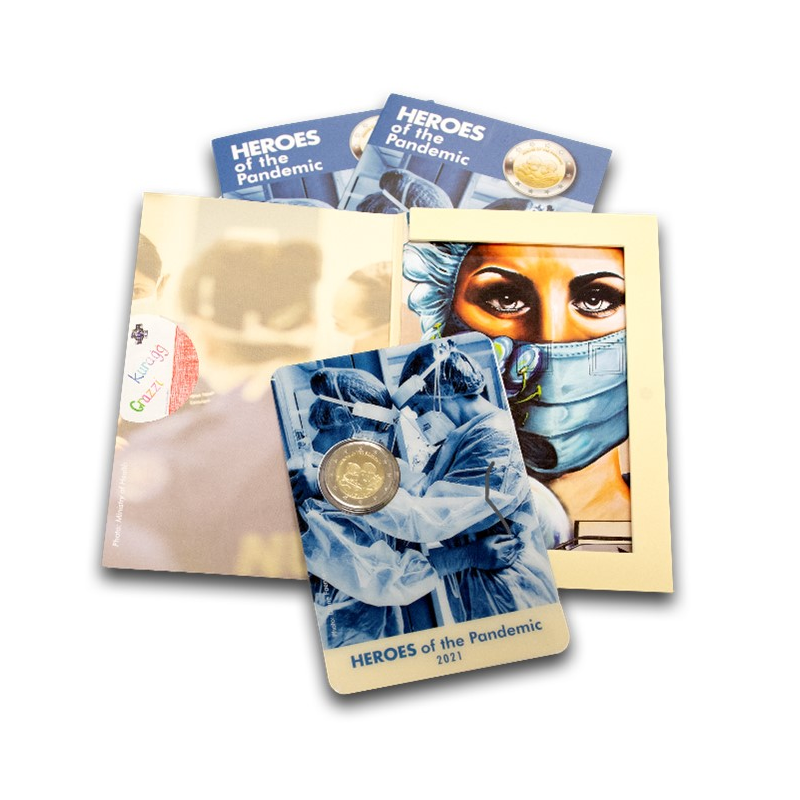 Opis: Głównym motywem monety, który zaprojektowała Maria Anna Frisone, są dwie pielęgniarki szykujące się na spotkanie z nieznaną przyszłością. Moneta jest wyrazem czci dla służby tych, którzy z poświęceniem trwali na pierwszej linii walki z pandemią COVID‑19. W górnej części biegnie półkoliście napis „HEROES OF THE PANDEMIC” (bohaterzy pandemii), a w dolnej części – napis „MALTA – 2021”. W otoku monety widnieje 12 gwiazd z flagi Unii Europejskiej.