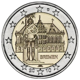 Opis: Środkowa część monety przedstawia ratusz w Bremie, a przed nim na pierwszym planie posąg Rolanda. Pod ratuszem, na prawo od posągu, widnieje napis „BREMEN”, a nad ratuszem po lewej – znak mennicy: „A”, „D”, „F”, „G” lub „J”. Bezpośrednio pod posągiem umieszczono inicjały projektanta monety Bodo Broschata.