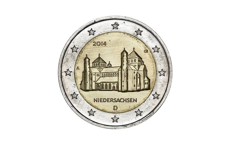 Opis: Moneta przedstawia kościół św. Michała w Hildesheim w Dolnej Saksonii, który w 1985 został wpisany na listę światowego dziedzictwa kulturowego UNESCO. Na górze znajduje się rok emisji „2014”, a po lewej stronie – znak mennicy („A”, „D”, „F”, „G” lub „J”). Na dole umieszczono napis „NIEDERSACHSEN” (Dolna Saksonia), pod nim – oznaczenie kraju emisji „D”, zaś na górze po prawej stronie – inicjały grawera Ottona Ericha „OE”. W otoku monety widnieje 12 gwiazd Unii Europejskiej.