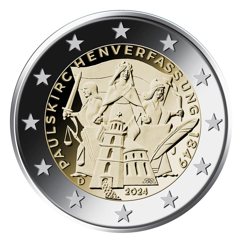 Opis: Na motyw składa się kilka warstw tematycznych. Na pierwszym planie widać perspektywiczny obraz kościoła św. Pawła i wchodzących do niego delegatów na zgromadzenie konstytucyjne. W kolejnej warstwie przedstawiono dokument konstytucji i pióro, które symbolizują rezultat prac frankfurckiego parlamentu. Zwieńczeniem motywu są trzy kobiece alegorie – Jedność, Sprawiedliwość i Wolność – oraz trójkolorowa, czarno‑czerwono‑złota flaga. Dynamiczny trójwymiarowy relief odnosi się do ponadczasowości podstawowych zasad demokracji, które po raz pierwszy spisano i zasadniczo utrwalono w konstytucji frankfurckiej. Wokół wewnętrznej części monety umieszczono napis „PAULSKIRCHENVERFASSUNG 1849” (KONSTYTUCJA UCHWALONA W KOŚCIELE ŚW. PAWŁA 1849), a na dole – rok emisji „2024”, kod kraju emisji (Niemcy) „D”, znak odpowiedniej mennicy („A”, „D”, „F”, „G” lub „J”) oraz inicjały projektanta, berlińskiego artysty Boda Broschata. W otoku monety widnieje 12 gwiazd z flagi Unii Europejskiej.