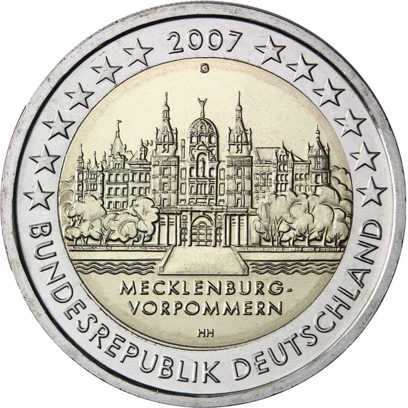 Opis: Moneta przedstawia zamek w Schwerin oraz napis „Mecklenburg-Vorpommern” (Meklemburgia-Pomorze Przednie: kraj związkowy, w którym leży ten zamek). Powyżej widnieje odpowiedni znak mennicy („A”, „D”, „F”, „G” lub „J”), a poniżej inicjały grawera „HH”. W otoku przedstawiono rok wybicia monety – 2007 – oraz 12 gwiazd Unii Europejskiej i słowa „Bundesrepublik Deutschland”.