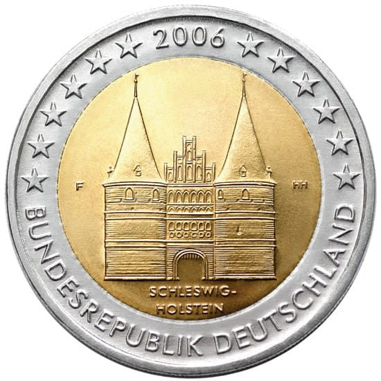 Opis: Część środkowa monety przedstawia Holstentor, bramę miejską będącą symbolem Lubeki. Pod nią znajduje się napis „Schleswig-Holstein” – nazwa pierwszego spośród 16 krajów związkowych, które mają zostać upamiętnione na monetach euro. Po prawej stronie umieszczono inicjały grawera „HH”, a po lewej widnieje odpowiedni znak mennicy („A”, „D”, „F”, „G” lub „J”). W otoku przedstawiono rok wybicia monety – 2006 – oraz 12 gwiazd Unii Europejskiej i słowa „Bundesrepublik Deutschland”.
