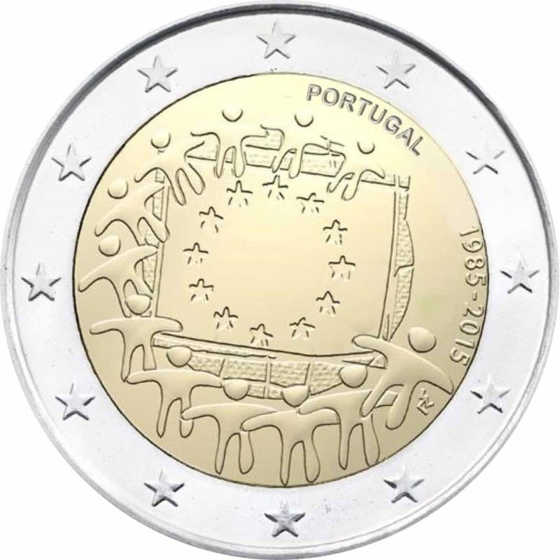 Opis: Moneta przedstawia unijną flagę jako symbol, który jednoczy ludzi i kultury wokół wizji i ideałów lepszej wspólnej przyszłości. Dwanaście gwiazd przechodzących w postaci ludzi okala narodziny nowej Europy. Górą po prawej stronie biegną po półokręgu nazwa kraju emisji i daty „1985–2015”, a niżej znajduje się monogram projektanta Georgiosa Stamatopoulosa. W otoku monety widnieje 12 gwiazd Unii Europejskiej.