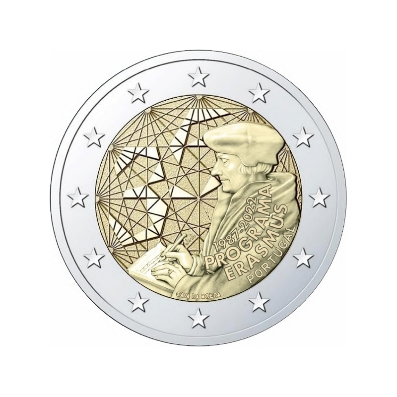 2 euro z 2022 r. poświęconą 35. rocznicy powstania programu Erasmus. Motyw monety przedstawia postać filozofa Erazma z Rotterdamu podczas pisania. W tle liczne linie łączą się w różnych punktach symbolizujący liczne wymiany intelektualne i ludzkie między studentami europejskimi. Wśród tych linii pojawia się również liczba 35, przedstawiona w nowoczesnym stylu graficznym, symbolizująca trzydziestą piątą rocznicę programu Erasmus.