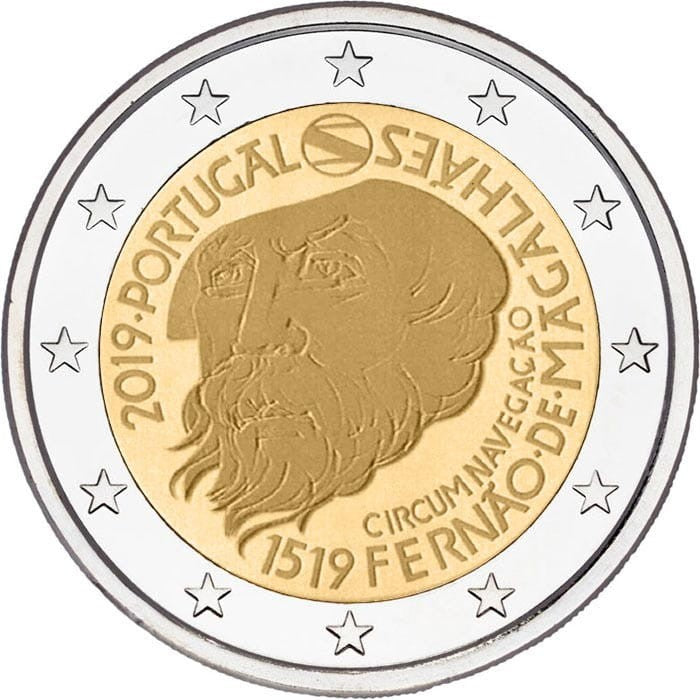 Opis: Pierwszego opłynięcia kuli ziemskiej dokonała w latach 1519–1522 hiszpańska ekspedycja do Indii Wschodnich. Głównym motywem monety jest wizerunek Magellana. Przy otoku po prawej stronie biegną w dwóch rzędach napisy „CIRCUM NAVEGAÇÃO” (Opłynięcie globu) i „1519 FERNÃO DE MAGALHÃES” (1519 Ferdynand Magellan), a po lewej umieszczono rok emisji „2019” i nazwę kraju emisji „PORTUGAL”. W otoku monety widnieje 12 gwiazd z flagi Unii Europejskiej.